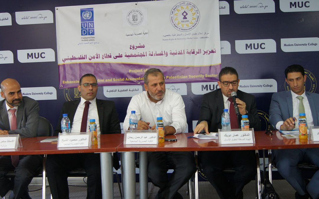 رام الله: نظم مركز إعلام حقوق الإنسان والديمقراطية “شمس” ندوة قانونية حول قرار بقانون الجرائم الالكترونية، والتي عقدت في الكلية العصرية الجامعية في رام الله حضرها طلبة القانون، وتحدث فيها كل من وكيل النيابة العامة السيد عماد حماد، مدير الهيئة المستقلة لحقوق الإنسان الدكتور عمار دويك، ومدير وحدة حقوق الإنسان في وزارة العدل ، وكل من الدكتور عبد الرحمن ريحان والدكتور محمود الشيخ من الكلية العصرية الجامعية، وتأتي هذه الندوة ضمن مشروع ” تعزيز الرقابة المدنية والمساءلة المجتمعية على قطاع الأمن الفلسطيني” والذي ينفذه مركز “شمس” بتمويل من برنامج الأمم المتحدة الإنمائي UNDP . وبالشراكة مع وزارة العدل الفلسطينية .