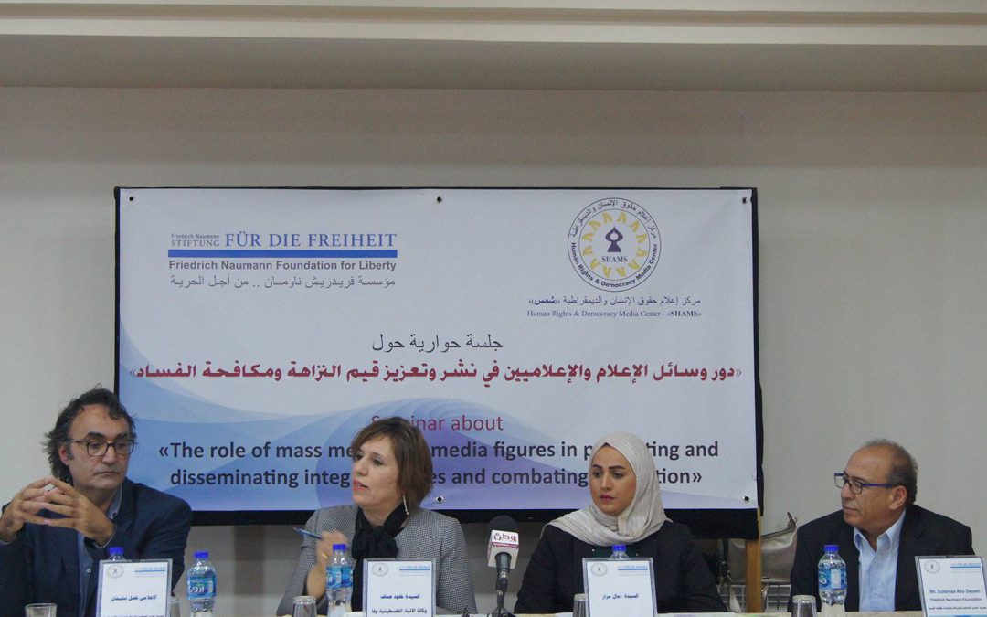 رام الله : أوصى إعلاميون وإعلاميات بضرورة تعزيز العلاقة بين الصحفيين ومؤسسات المجتمع المدني من أجل تعزيز قيم النزاهة والشفافية ومكافحة الفساد . وضرورة تمكين وتقوية الإعلام المستقل. ودعوة رؤساء ومدراء التحرير في وسائل الإعلام المختلفة إلى طاولة مستديرة من أجل تقييم مسيرة الإعلام الفلسطيني. وتفعيل تحالف أهلي واسع من أجل إقرار قانون الحق في الحصول على المعلومات. والعمل وحث المؤسسات الإعلامية لإنعاش وتطوير الصحافة الاستقصائية من خلال توفير الإمكانيات . والعمل على تعديل قانون الجرائم الإلكترونية. وإعداد وتنفيذ برامج تدريبية متخصصة للصحفيين والصحفيات لزيادة الوعي بقضايا الفساد . وإلى إنشاء شبكة صحفيين وإعلاميين وقانونيين ضد الفساد. وتقوية وتفعيل نقابة الصحفيين. جاء ذلك خلال ندوة حوارية نظمها مركز أعلام حقوق الإنسان والديمقراطية “شمس” بالتعاون وتمويل من مؤسسة فريدريش ناومن للحرية. بحضــور عدد كبير من العاملين في وســائل الإعلام المحلية والعربية . بعنوان ” دور الإعلام والإعلاميين في تعزيز قيم النزاهة والشفافية ومكافحة الفســاد” والتحديات التــي تواجــه العاملين في الإعلام في عدم تنــاول قضايا الفســاد وفي كيفيــة الحصول على المعلومة الدقيقة المســتندة إلى وثائق ووقائع حقيقية.