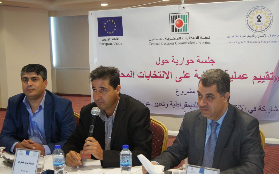 رام الله: نظم مركز إعلام حقوق الإنسان والديمقراطية ” شمس” بالتعاون مع لجنة الانتخابات المركزية وبدعم من الاتحاد الأوروبي، جلسة حوارية لتقييم عملية الرقابة على الهيئات المحلية، حضرها ممثلين عن مؤسسات المجتمع المدني التي شاركت كهيئات رقابية لعرض تجربة مؤسساتهم في عملية الرقابة على العملية الانتخابية.