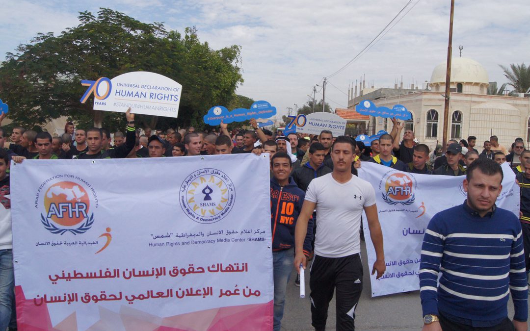 رام الله: نظم مركز إعلام حقوق الإنسان والديمقراطية ” شمس” بالتعاون والتنسيق مع مفوضية الأمم المتحدة لحقوق الإنسان في الأرض الفلسطينية المحتلة، والفدرالية العربية لحقوق الإنسان في دولة الإمارات العربية المتحدة ومحافظة أريحا والأغوار، ماراثوناً للمشي في مدينة أريحا تحت شعار ” كل شخص هو مدافع عن حقوق الإنسان” وذلك في ذكرى اليوم العالمي لحقوق الإنسان الذي يصادف العاشر من شهر كانون الأول من كل عام.