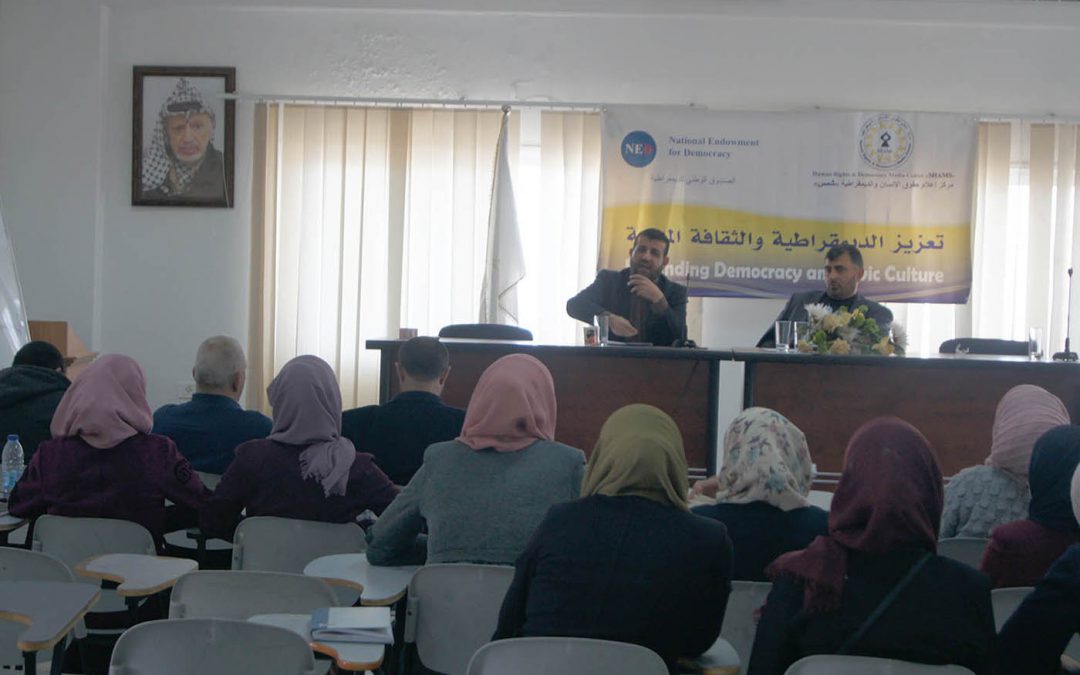 بيت لحم: نظم مركز إعلام حقوق الإنسان والديمقراطية ” شمس” ورشة عمل حول حقوق المرأة بين الشريعة الإسلامية والمواثيق الدولية، حضرها مجموعة من طلبة كلية الفقه والقانون في جامعة فلسطين الأهلية في بيت لحم ، وتأتي هذه الورشة ضمن مشروع تعزيز الثقافة المدنية لطلبة الشريعة في محافظات الضفة الذي ينفذه المركز بالتعاون مع الصندوق الوطني للديمقراطية (NED).