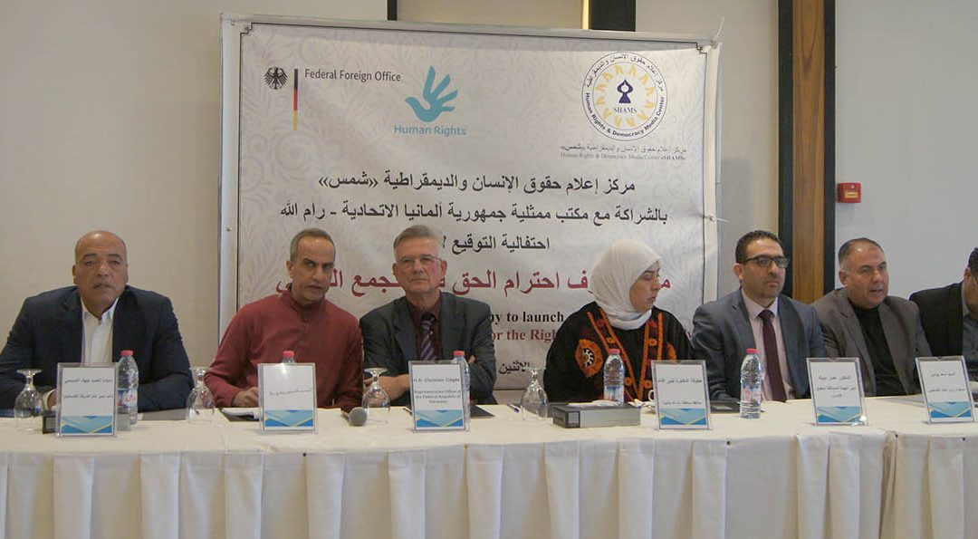 رام الله: احتفل مركز إعلام حقوق الإنسان والديمقراطية “شمس” بالتعاون مع ممثلية جمهورية ألمانيا في فلسطين، بالتوقيع وإطلاق ميثاق شرف لاحترام الحق في التجمع السلمي، وذلك بمشاركة ممثل جمهورية ألمانيا الاتحادية في فلسطين السفير كريستيان كلاغيس، ,محافظ محافظة رام الله الدكتورة ليلى غنام، ومستشار وزير العدل الفلسطيني أسعد يونس، ونائب مدير الشرطة الفلسطينية العميد جهاد المسيمي، ومدير الهيئة المستقلة لحقوق الإنسان الدكتور عمار دويك، ورئيس اللجنة القانونية وعضو مجلس نقابة المحاميين المحامي داوود الدرعاوي، ورئيس مجلس إدارة شبكة المنظمات الأهلية شذى عودة، وممثلاً عن مجلس منظمات حقوق الإنسان شعوان جبارين، وبحضور أعضاء اللجنة التنفيذية لمنظمة التحرير الفلسطينية الأستاذ عزام الأحمد ، والدكتور فيصل عرنكي ، والأستاذ صالح رأفت ، وممثلي مؤسسات المجتمع المدني، وممثلي الوزارات، ورؤساء البعثات والممثليات،محامين، صحفيين، وباحثين وأكاديميين.الأجهزة الأمنية .