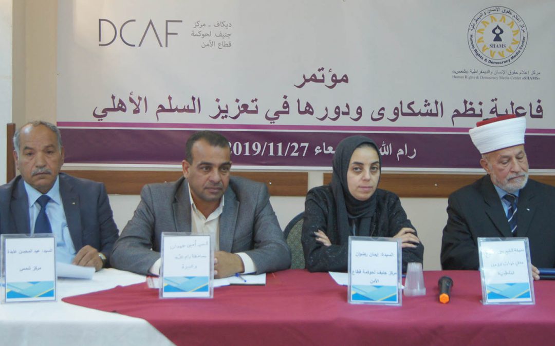 رام الله: نظم مركز إعلام حقوق الإنسان والديمقراطية ” شمس” بالتعاون مع مركز جنيف لحوكمة قطاع الأمن مؤتمراً حول فاعلية نظم الشكاوى ودورها في تعزيز السلم الأهلي ، شارك فيه ممثلي عدد من الوزارات ومؤسسات المجتمع المدني المحلية والدولية، المحافظات ، رجال الإصلاح ، محامين، صحفيين ، أكاديميين .