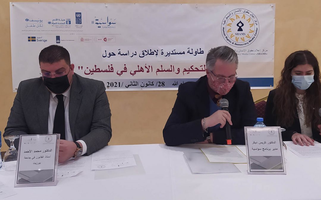 رام الله: نظم مركز إعلام حقوق الإنسان والديمقراطية “شمس” لقاءاً لإطلاق دراسة حول ” التحكيم والسلم الأهلي في فلسطين”، حضرها ممثلين عن المؤسسات الرسمية ، ومؤسسات المجتمع المدني ، الغرف التجارية ، النقابات، محكمين ، باحثين، أكاديميين، ونشطاء مجتمعيين. يأتي هذا اللقاء ضمن مشروع ” تعزيز وصول المواطنين إلى الطرق الرسمية البديلة لحل النزاعات ” بدعم من برنامج سواسية المشترك .
