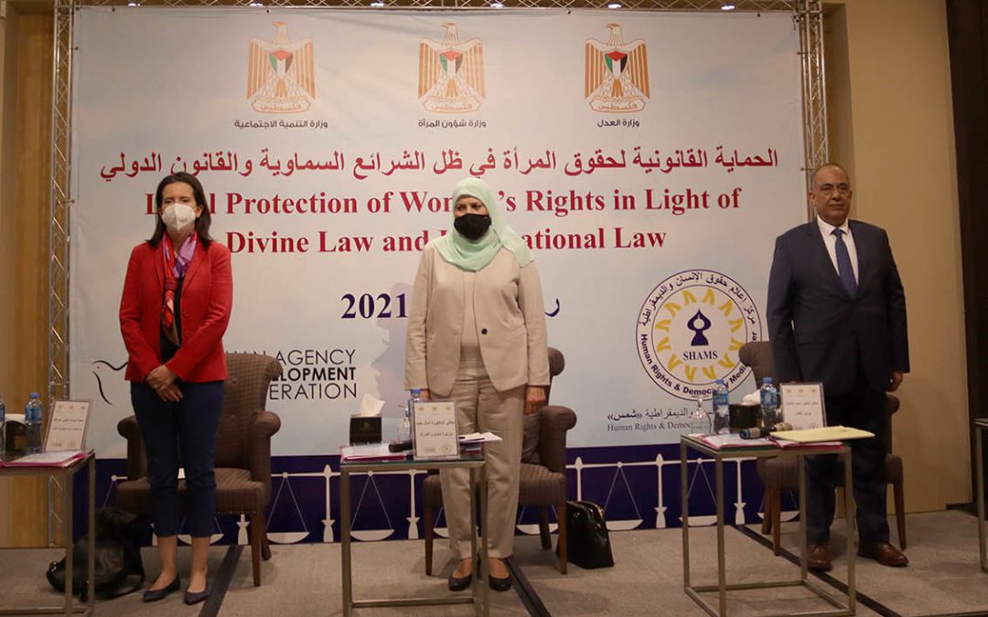 رام الله: نظمت كل من وزارة العدل ووزارة شؤون المرأة ومركز إعلام حقوق الإنسان والديمقراطية “شمس” مؤتمراً حول الحماية القانونية لحقوق المرأة في ظل الشرائع السماوية والقانون الدولي الإنساني، بدعم وتمويل من الوكالة الايطالية للتعاون الإنمائي ، حضره عدد من ممثلي البعثات الدبلوماسية ، وممثلي الوزارات والمؤسسات الرسمية، ومنتسبي الأجهزة الأمنية وجهات إنفاذ القانون، وموظفي المجلس التشريعي، وممثلي المنظمات المدنية المحلية والدولية .