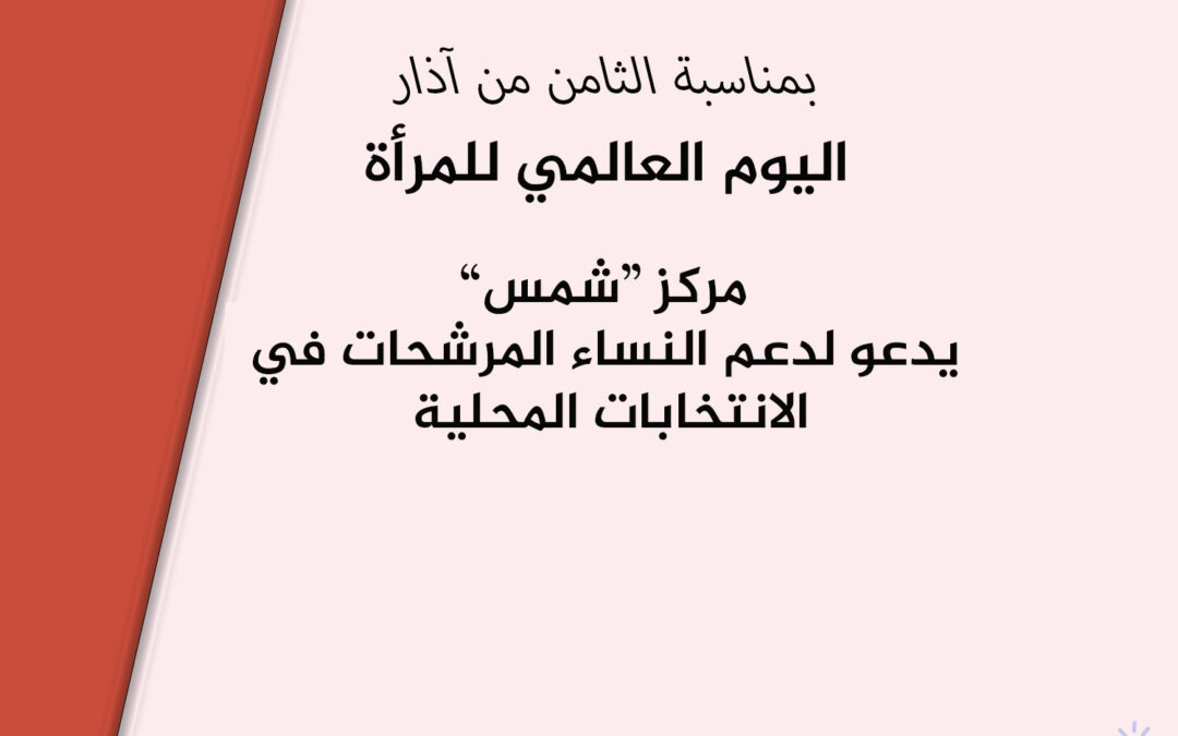 يدعو مركز “شمس” إلى تضافر الجهود بين مختلف المكونات ، وإلى ضرورة دعم النساء في الانتخابات المحلية ، لا سيما تلك القوائم التي ترأسها امرأة ، وذلك في مختلف مراحل العملية الانتخابية، كما ويدعو وسائل الإعلام الفلسطينية على اختلافها ، لأخذ دورها في دعم المرأة من خلال تأكيده على حقها في المشاركة وإبراز قدرات النساء في مختلف مجالات الحياة ، وعلى أساس أن في مشاركة المرأة ومساهمتها مصلحة للرجل والمرأة والمجتمع وتأكيد أنها ليست معركة بين المرأة والرجل. فالمطلوب من وسائل الإعلام العمل بصورة حثيثة لتغيير الصورة النمطية للمرأة ، وتسليط الضوء على النساء كمواطنات فاعلات صاحبات رؤية وتفكير قادرات على تحقيق إنجازات تتراكم وتستمر على جميع الأصعدة السياسية والاقتصادية والاجتماعية والثقافية. والسعي لتغيير الانطباع الاجتماعي السائد الخاص بالمرأة عن طريق حملات للتوعية بهدف تشجيع النساء والرجال لانتخاب النساء وشرح المفاهيم الديمقراطية وأهمية مشاركة المرأة في مواقع صنع القرار. وتعديل الاتجاهات حيال مشاركة المرأة ودورها وحقوقها وحيال التوزيع التقليدي للأدوار في الأسرة والمجتمع وتأكيد مبدأ المساواة والمواطنة التامة للمرأة من خلال جهود وسائل الإعلام .