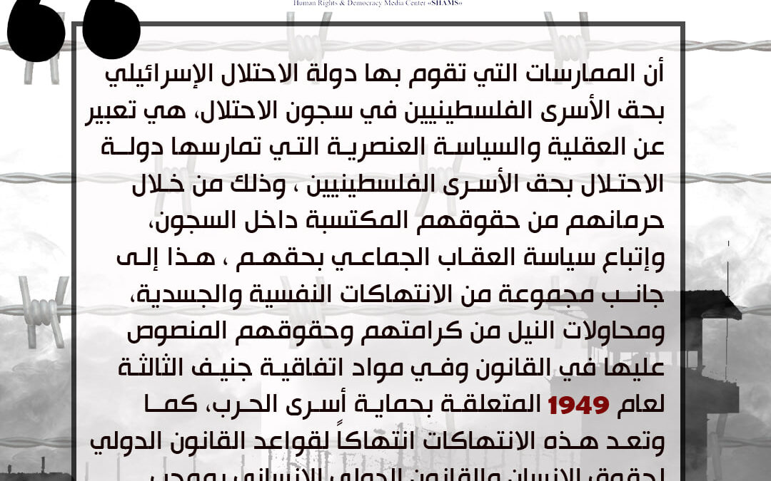 يدين مركز إعلام حقوق الإنسان والديمقراطية “شمس” استمرار اعتقال دولة الاحتلال لنحو (4450) أسيراً، بينهم (32) امرأة، و(160) طفلاً تقل أعمارهم عن 18 عاماً، و(530) معتقلاً إدارياً. وهو ما يشكل انتهاكاً للقانون الدولي الإنساني، لاسيما لاتفاقية جنيف الثالثة بشأن معاملة أسرى الحرب فوفقاً للمادة (118) من ذات الاتفاقية ( يفرج عن أسرى الحرب ويعادون إلى أوطانهم دون إبطاء بعد انتهاء الأعمال العدائية الفعلية في حالة عدم وجود أحكام تقضى بما تقدم في أي اتفاقية معقودة بين أطراف النزاع بشأن وضع نهاية للأعمال العدائية، أو إذا لم تكن هناك اتفاقية من هذا النوع، تضع كل دولة من الدول الحاجزة بنفسها وتنفذ دون إبطاء خطة لإعادة الأسرى إلى وطنهم ) .تتماشى مع المبدأ الوارد بالفقرة السابقة. ويجب في كلتا الحالتين إطلاع أسرى الحرب على التدابير المقررة. كما نصت المادة (77) من اتفاقية جنيف الرابعة بشأن حماية الأشخاص المدنيين في وقت الحرب على أن ( يسلم الأشخاص المحميون الذين اتهموا أو أدانتهم المحاكم في الأراضي المحتلة، مع الملفات المتعلقة بهم، عند انتهاء الاحتلال إلى سلطات الأراضي المحررة).