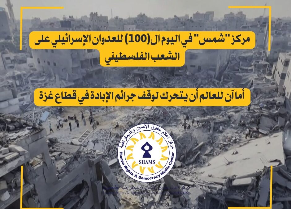 يؤكد مركز إعلام حقوق الإنسان والديمقراطية “شمس” أن استمرار الاحتلال في عدوانه على قطاع غزة منذ (100) يوماً للعدوان ، كشف زيف إدعاء بعض الدول الكبرى والمؤثرة في السياسة الدولية ، والتي تتحدث دوماً عن حقوق الإنسان والقانون الدولي ، فأما آن للعالم أن يتحرك لوقف جرائم الإبادة التي يرتكبها الاحتلال الإسرائيلي بشكل ممنهج ومنظم بحق المدنيين في قطاع غزة، إذ أن هذه الأعداد الكبيرة من الضحايا المدنيين وصور الدمار الهائل والممنهج للأعيان المدنية الذي يقوم به جيش الاحتلال الإسرائيلي في قطاع غزة لم تحرك ضمير العالم الساكن، رغم فظاعتها ومأساويتها، وهي تتشابه إلى حد كبير مع جرائم الإبادة التي ارتكبت أبان الحرب العالمية الثانية والتي راح ضحيتها الملايين من الأبرياء، وقال المركز أن الرد على الفظائع التي ارتكبت في الحرب العالمية الثانية كان بإنشاء منظمة الأمم المتحدة ، وبإقرار العديد من المعاهدات الدولية لحقوق الإنسان لضمان عدم تكرار مثل تلك الجرائم بحق البشرية جمعاء، وعلى الرغم من أن تلك الدول المنتصرة في الحرب العالمية الثانية ما زالت في صدارة المشهد الدولي ، إلا أنها لم تتحرك لتوفير الحماية للشعب الفلسطيني ، بل على العكس تماً تقف إلى جانب الاحتلال في عدوانه على قطاع غزة .