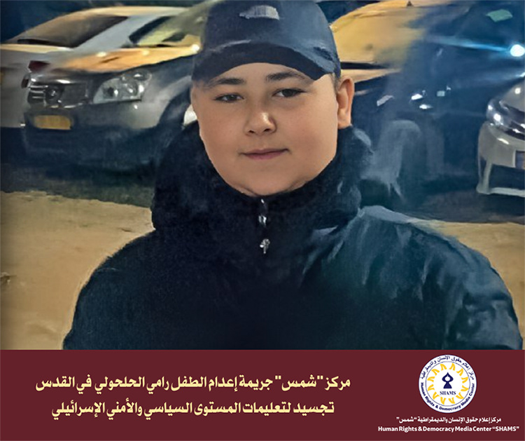 يدين مركز إعلام حقوق الإنسان والديمقراطية “شمس” جريمة إعدام الطفل (رامي حمدان الحلحولي) البالغ من العمر (12) في مخيم شعفاط بمدينة القدس مساء الثلاثاء الموافق 12/3/2024م، أثناء قيامه وزملائه باللهو بألعاب ترفيهية في ساحة المخيم، إذ أطلق قناص من جيش الاحتلال النار عليه من داخل برج محصن قريب وأصابه إصابة مباشرة، كما وقام جيش الاحتلال باعتقاله وهو جريح ينزف ليتم الإعلان عن استشهاده لاحقاَ.