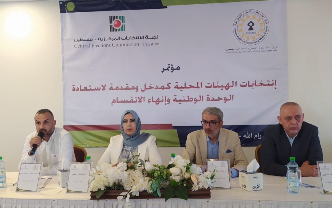 رام الله – نظم مركز إعلام حقوق الإنسان والديمقراطية “شمس” بالتعاون والشراكة مع لجنة الانتخابات المركزية، مؤتمراً بعنوان “انتخابات الهيئات المحلية كمدخل ومقدمة لاستعادة الوحدة الوطنية وإنهاء الانقسام”، حضره ممثلي المؤسسات الرسمية والأمنية ومؤسسات المجتمع المدني، ممثلي الهيئات المحلية، ممثلي الفصائل الحزبية، ممثلي القوائم المستقلة، ممثلي المؤسسات الإعلامية ووسائل الإعلام، خبراء في الشأن الانتخابي، شخصيات اعتبارية، أكاديميين، ومواطنين.
