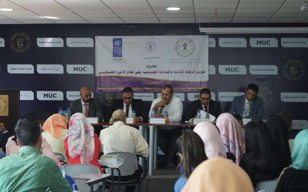 Ramallah: Human Rights and Democracy Media Center “SHAMS” organized a legal seminar on a decree by law of Cybercrime, at Modern University College in Ramallah, attended by law students. Speakers are Mr. Imad Hammad deputy of Public Prosecution, Dr. Ammar Dwaik, director of the Independent Commission for Human Rights, and director of Human Rights Department at Ministry of Justice in addition to Dr. Abdulrahman Rihan and Dr. Mahmoud Alsheikh joining from Modern University College. This seminar is held within the project of “Enhancing civilian oversight and social accountability on the Palestinian security sectors” that is implemented by “SHAMS” center and is funded by UNDP, in partnership with Palestinian Ministry of Justice.