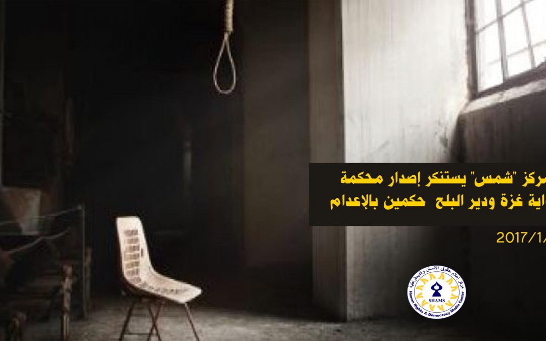“SHAMS” center strongly condemns inflicting death by handing on 24/1/2017 upon the citizen Khamis Jabra Zaki Shawwa (36) years by Court of First Instance of Gaza Strip, accused of murdering the citizen (Nahid Ibrahim Sawaf) in collaboration with another one. Also, Court of First Instance of Deir Albalah inflicted death by handing upon the citizen Ghasan Shafiq Ismail (49) years in the same day. Who lives in the center of Gaza Strip after being accused with murdering his brother (Adnan 30 years old).
