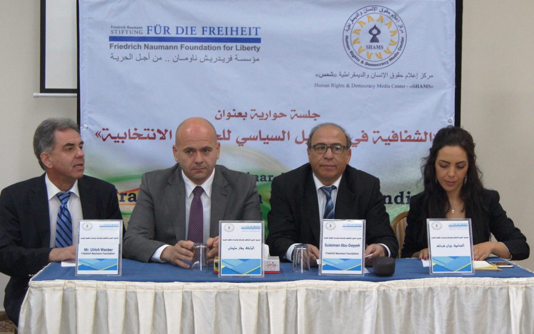 Ramallah: Human Rights and Democracy Media Center “SHAMS” organized a seminar about transparency in political funding for electoral campaigns, in Ramallah funded by Friedrich Naumann Foundation for Liberty (FNF). The event combined several participants from civil society organizations, political factions, official institutions, in addition to lawyers and some heads and coordinators of electoral lists. Advocate Rawan Farhat initiated the seminar who put emphasized that transparency and neutrality of the electoral process is considered the priority to guarantee trust in the electoral process and acknowledgment of its results. She highlighted that utilizing money in politics by uncontrolled political funding will affect the impartiality of elections. Since direct contributions within elections and other forms of financial support in some cases may represent a form of political influence.